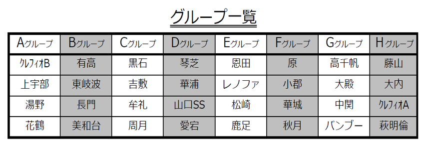 | B | 11:00 | クレフィオB | 湯野 | 花鶴 | 有高 | 長門 | 美和台 | ||